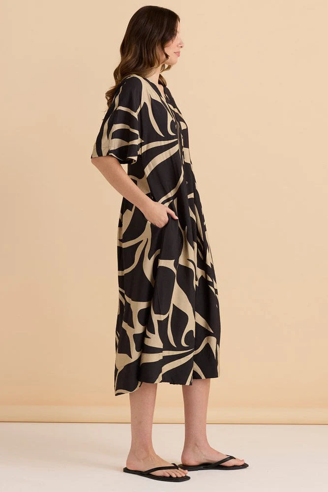 A flattering midi dress with a relaxed yet elevated feel. The V-neckline and button-through front keep it classic and easy to wear. Soft woven fabric provides comfortable movement. A transeasonal wardrobe essential with simple sophistication.