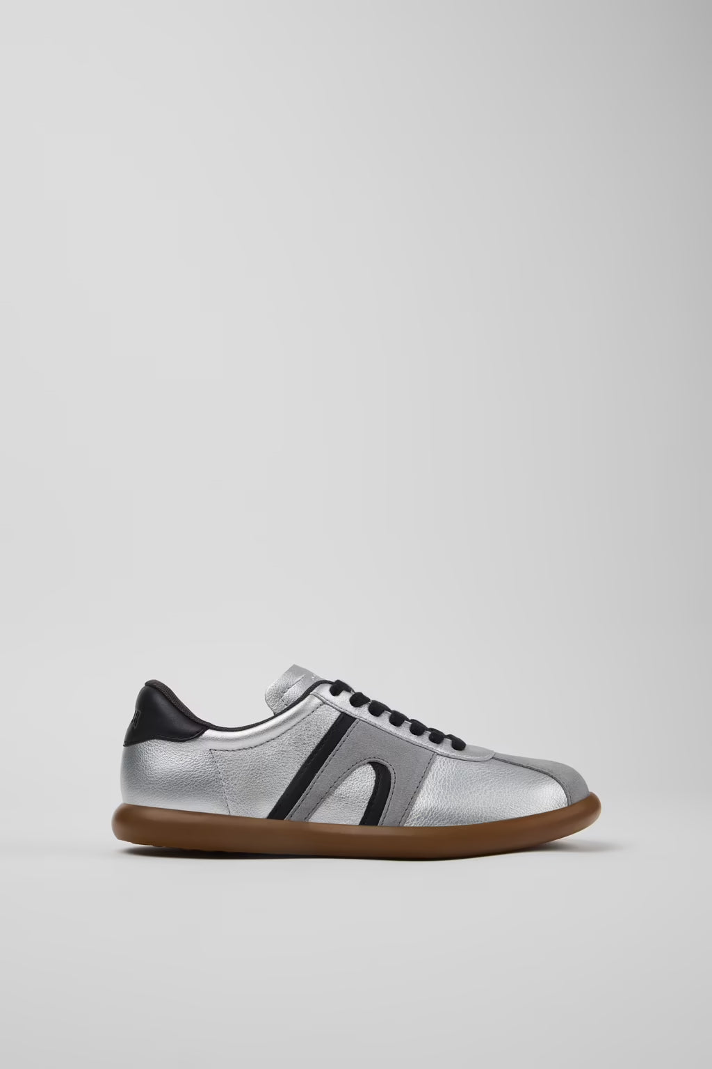 Silver and black calfskin leather women's sneakers with OrthoLite® Recycled™ footbeds and rubber outsoles.
