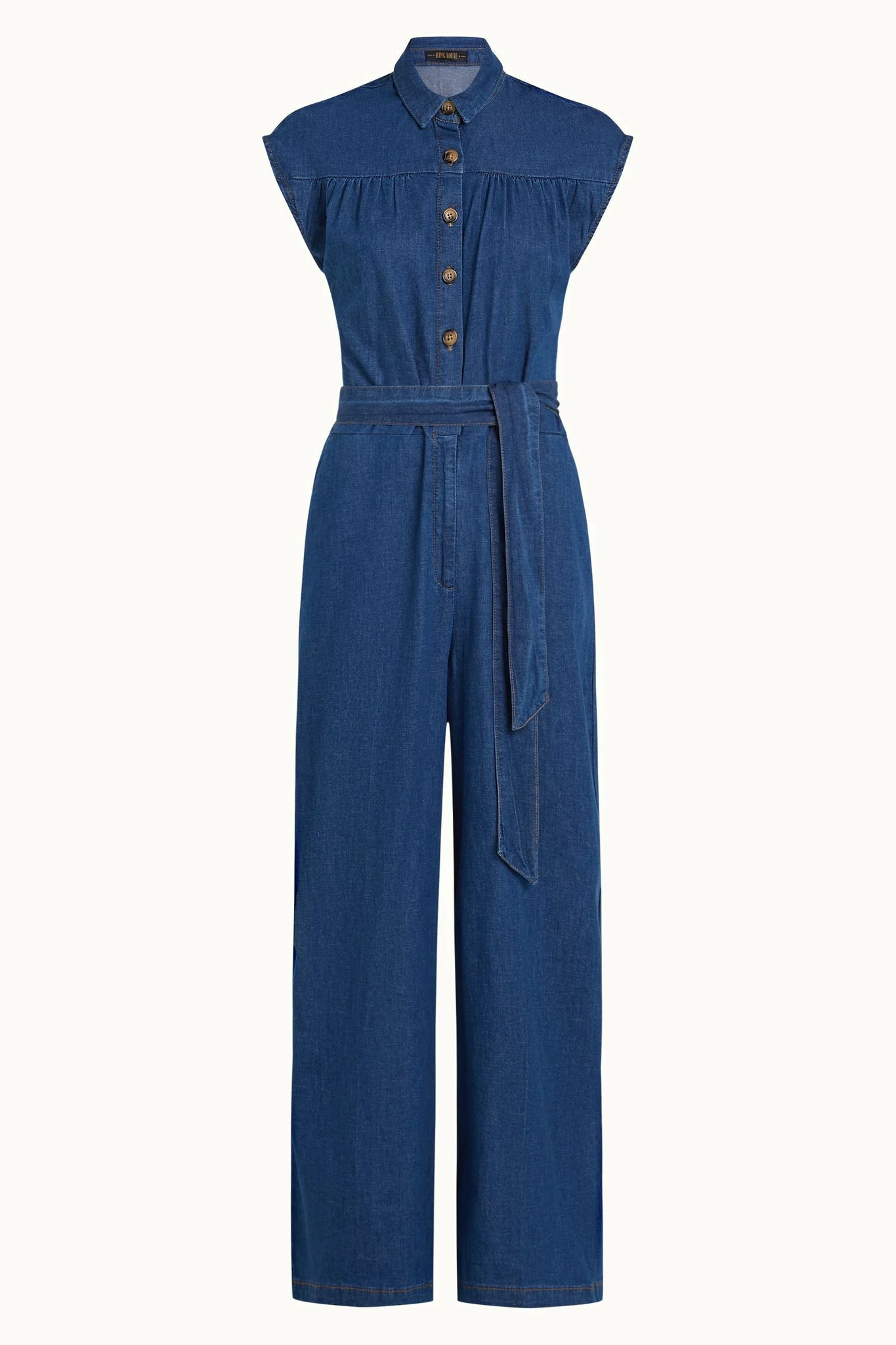 Comfortable jumpsuit with wide legs, cap-sleeves, and functional pockets. The belt at waist adds a stylish touch.