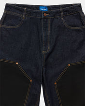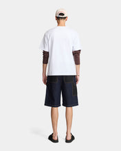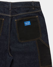 The Hunter Short is a relaxed fit short made from 100% cotton indigo denim with contrast tobacco stitching. The short features contrast ripstop knee panels and pockets, copper star-shaped rivets and a copper Larriet shank button. It is designed with a reinforced waistband and triple stitched leg seams for durability. It includes zip fly, front rounded pockets, a coin pocket, and two back patch pockets. Additionally, it offers a hammer loop, utility pocket and the Larriet Sun woven label. Model is 6'1" tall with a 32" waist and wears a size 32.