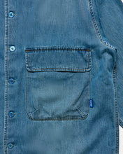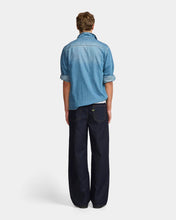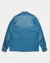 The Kendalls Long Sleeve Shirt is a relaxed, boxy-fit shirt with an unstructured flat collar. It is made from 100% cotton washed blue denim with contrast tobacco stitching. The design features large patch pockets with oversized flaps. There is a Larriet woven label on the wearer's left-hand side pocket. Male model is 6'2" tall with a 30" waist and wears a size L.