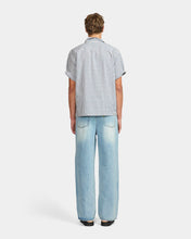 The Kendalls Short Sleeve Shirt is a relaxed, boxy-fit shirt with an unstructured flat collar. It is made from 100% cotton woven fabric. The design features large patch pockets with oversized flaps. There is a Larriet woven label on the wearer's left-hand side pocket. Male model is 6'2" tall with a 30" waist and wears a size L.