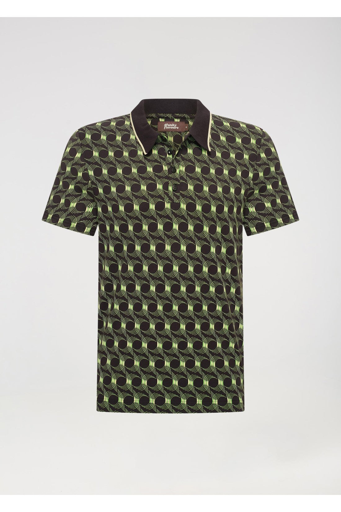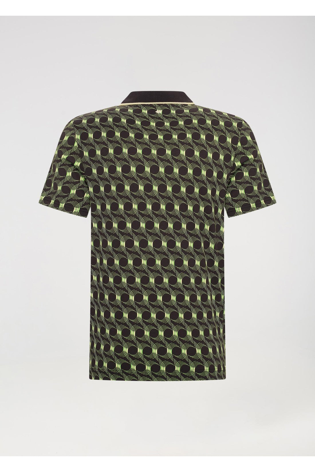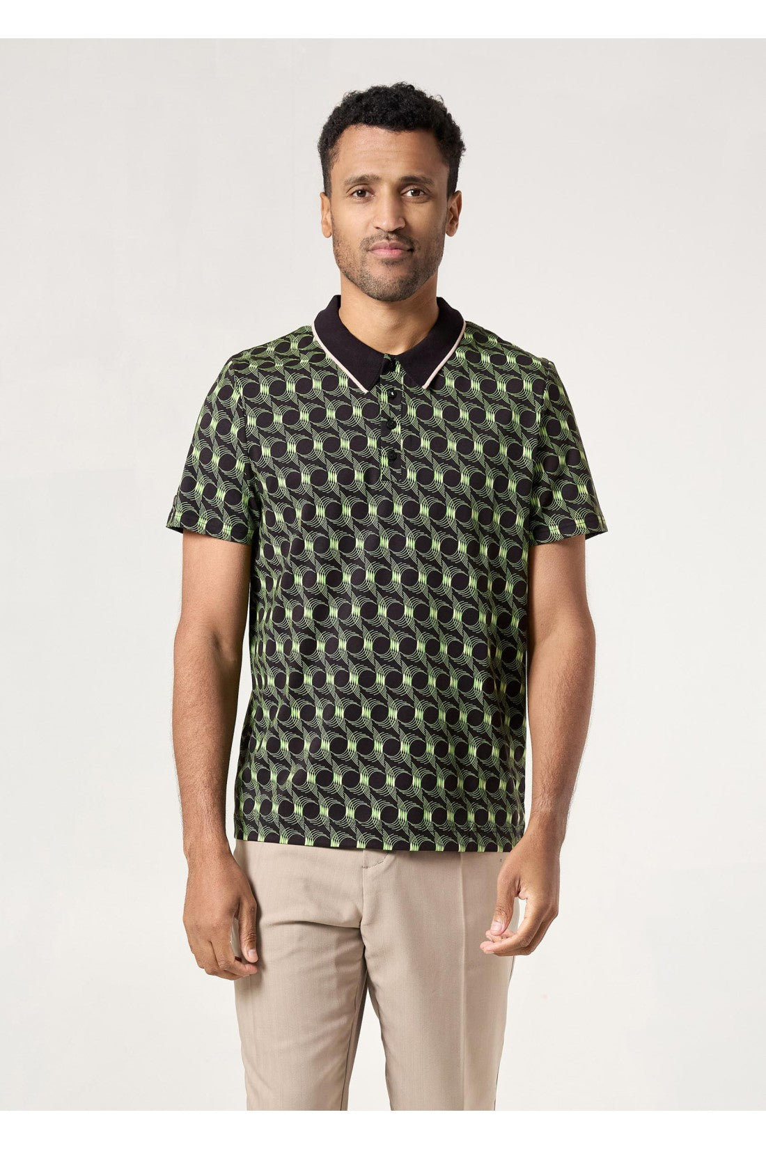 Jersey polo with elastane and ribbed collar. Graphic print, button fastening and short sleeves.