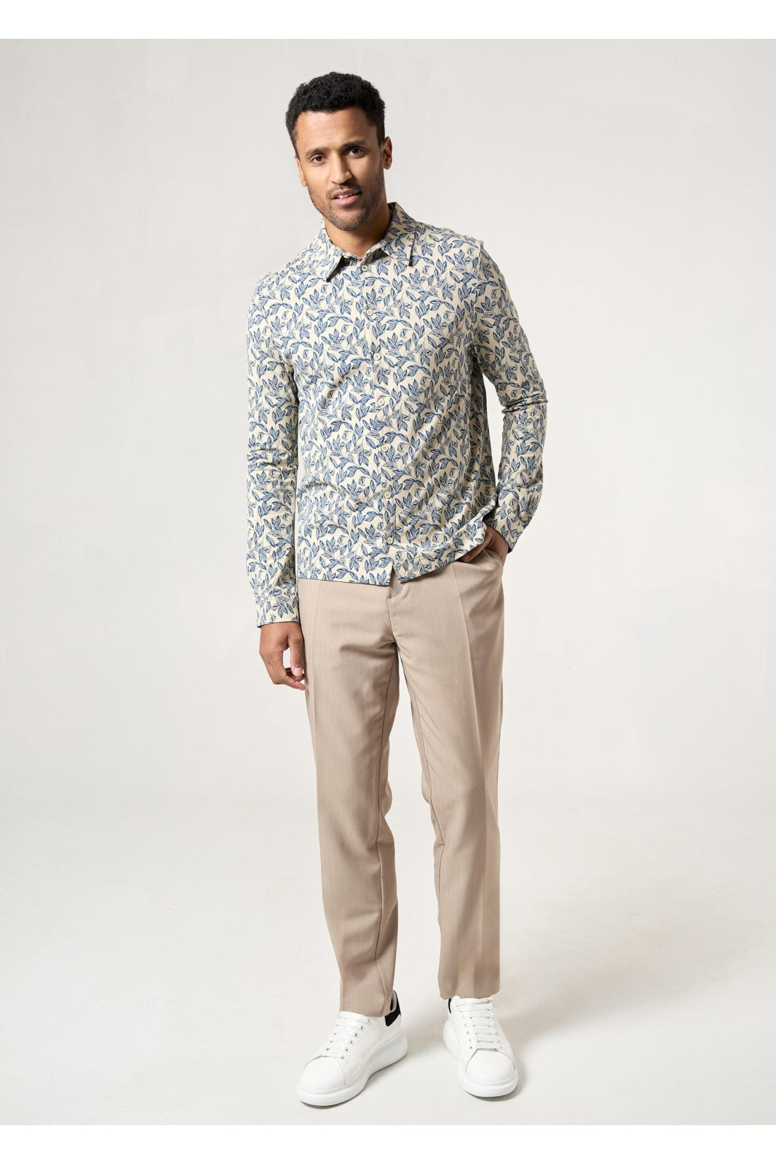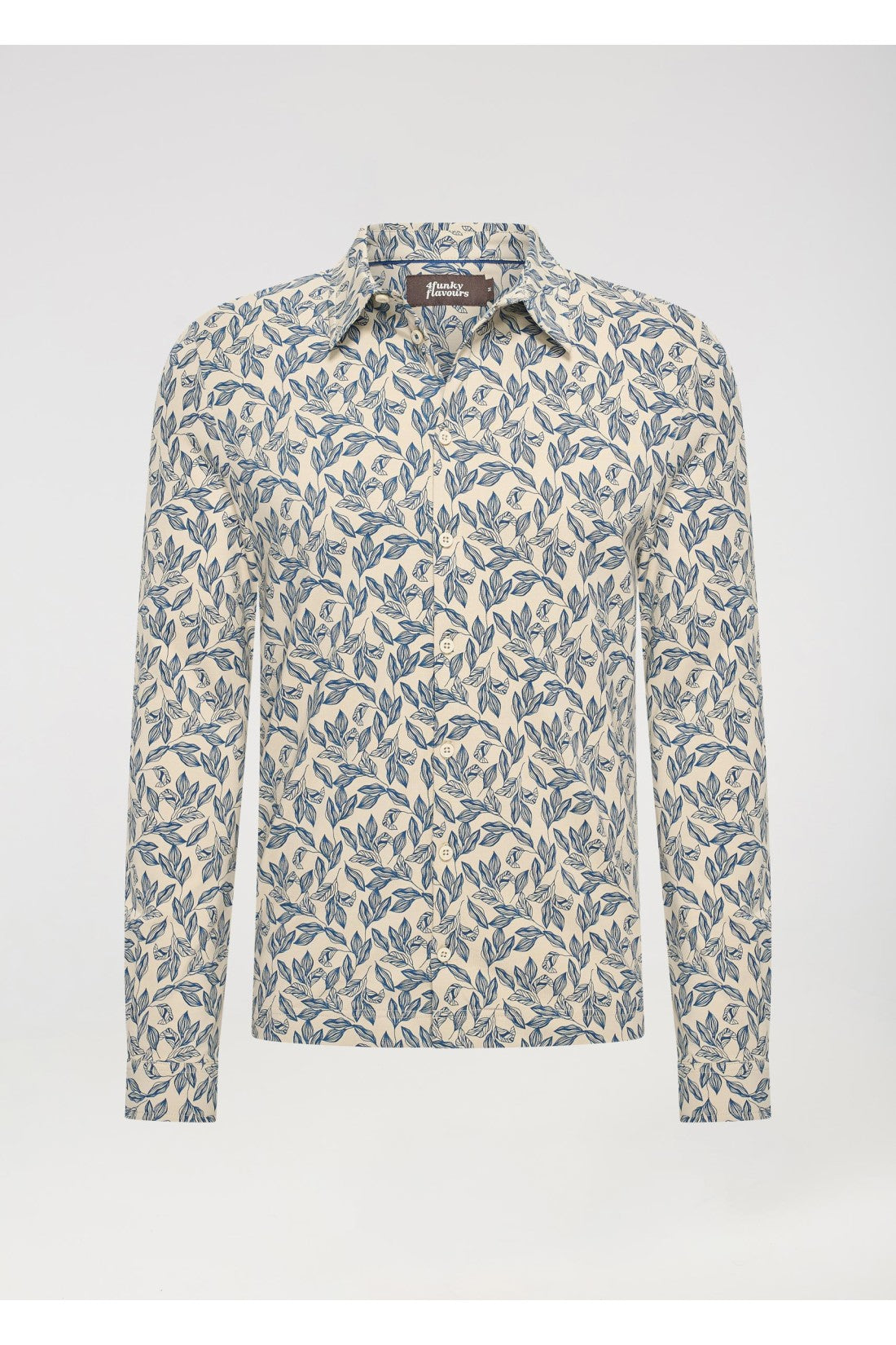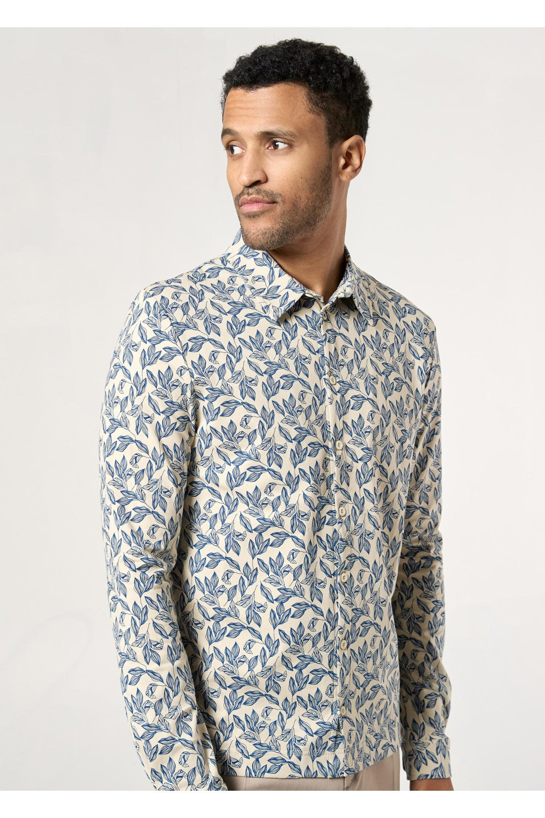 Jersey shirt with elastane and collar. Leaf print, button fastening and long sleeves.