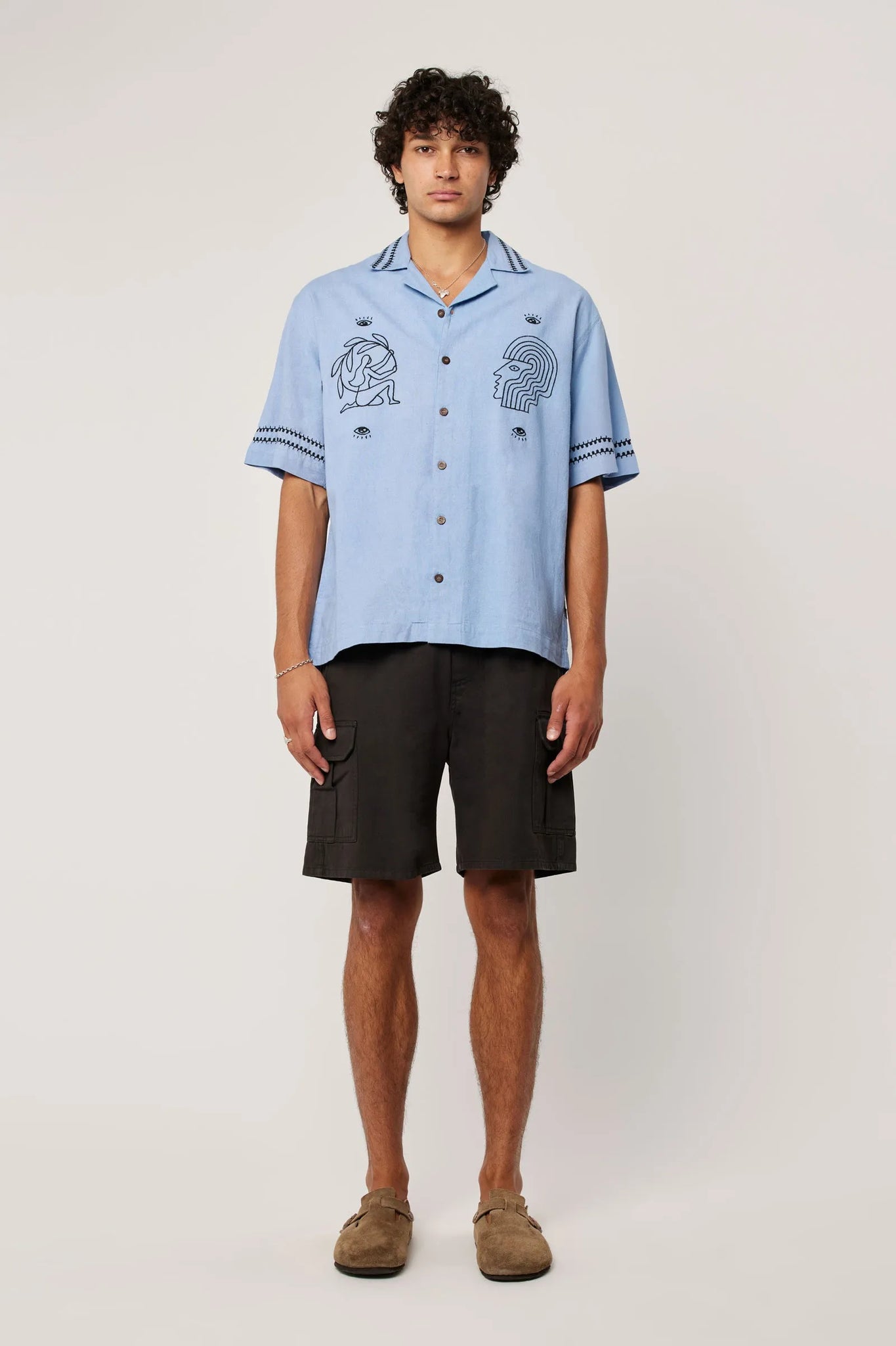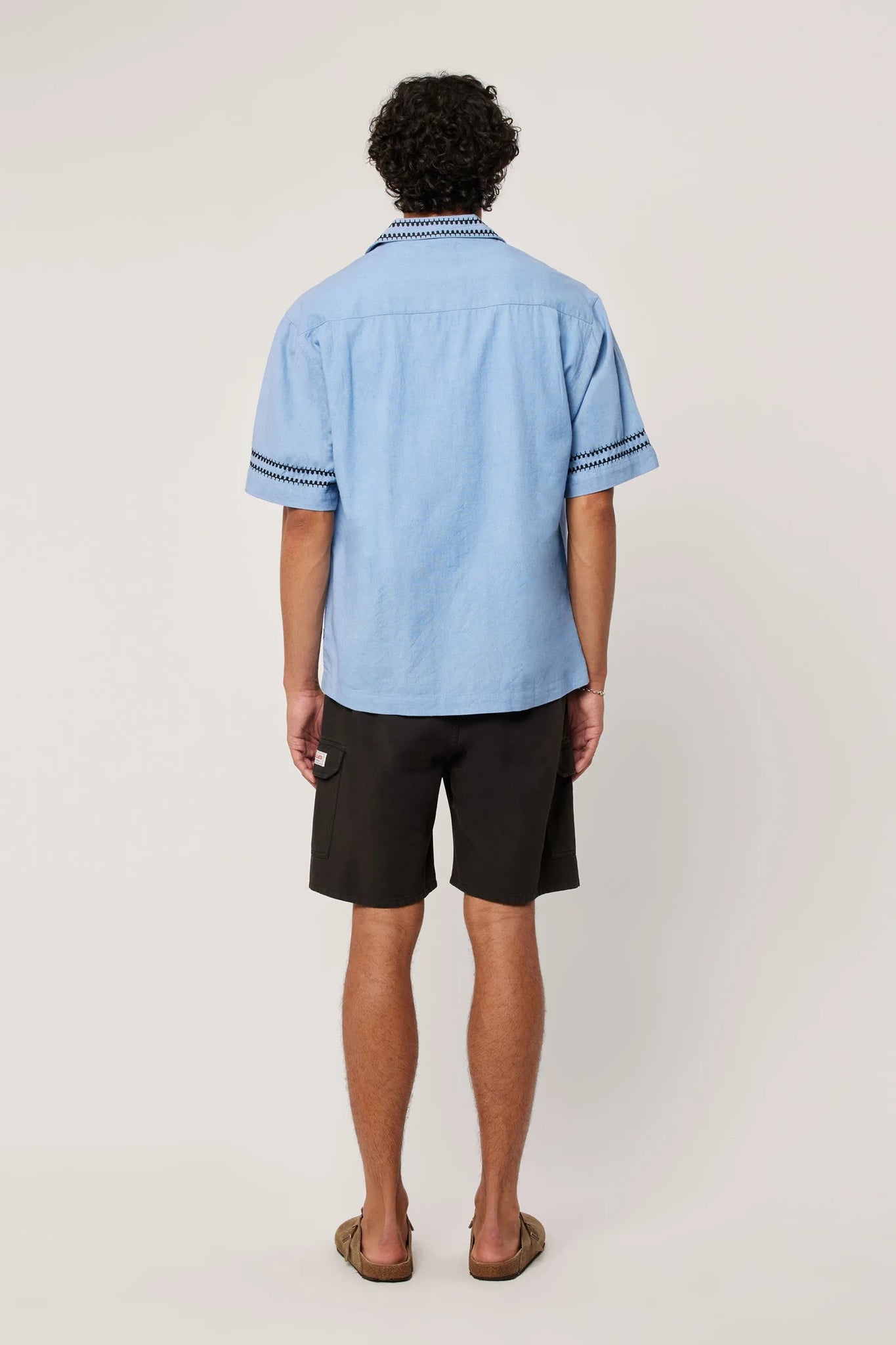 - Ocean blue colourway and black embroidery details on the front, collar and sleeves