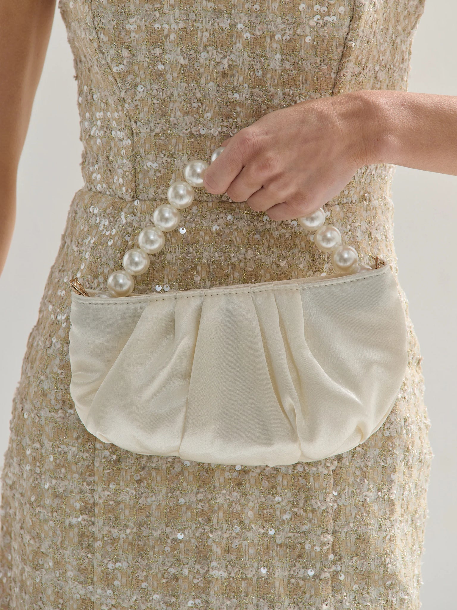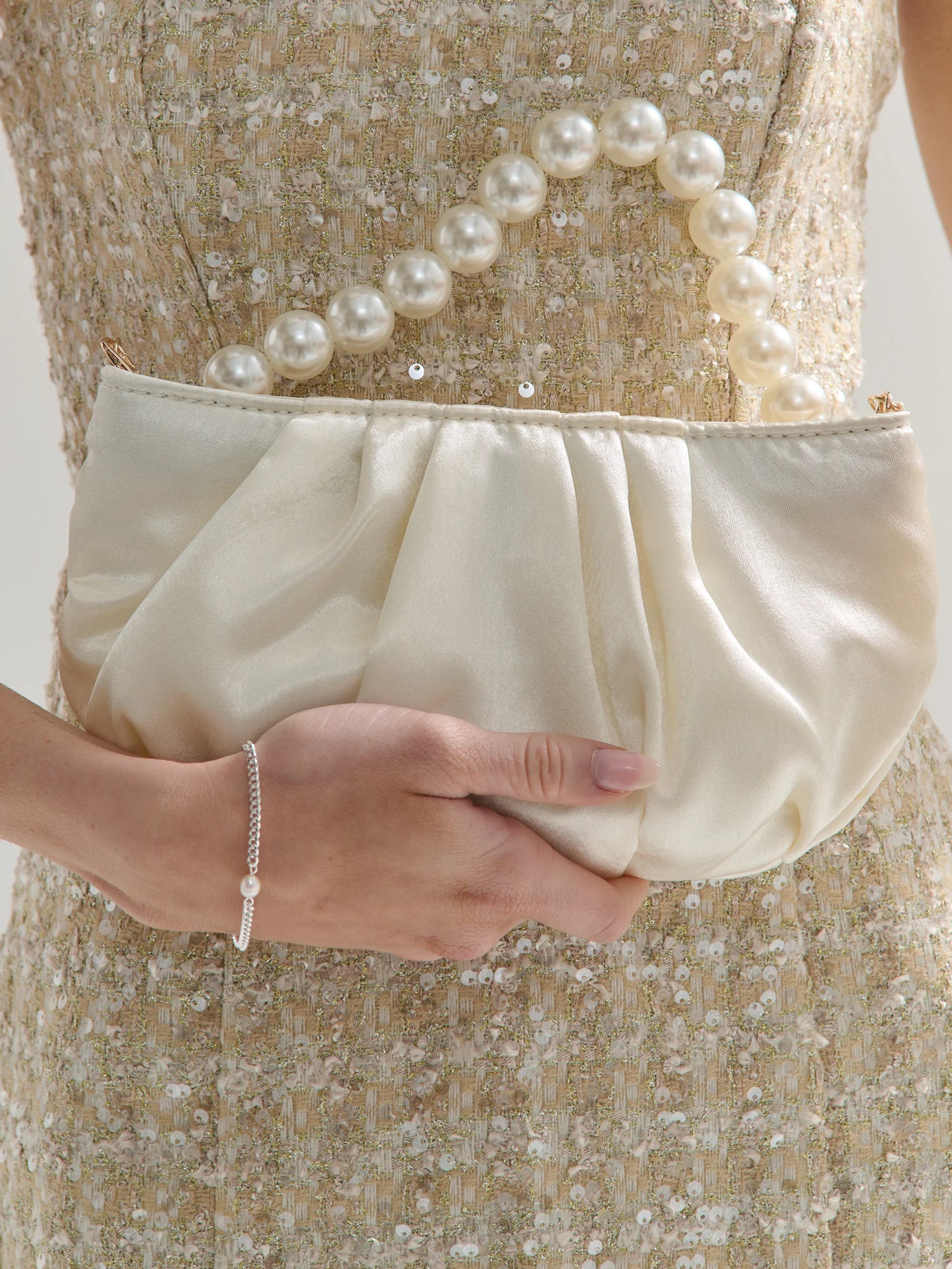 Material: High quality satin, Faux pearl strap, Poly cotton blend interior lining
