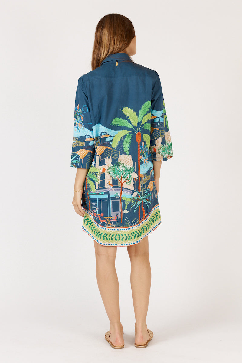 Let the conversation flow amongst your friends in the Rubyyaya Cest La Vie Shirtmaker Dress Navy. Crafted from quality 100% cotton in a super cute holiday vibe print and finished with detailed cotton embroidery over the front palm trees. Classic roll tab sleeves make it a versatile dress for both day and evening, and the contrast boarder print gives it a very polished casual look. Who doesn’t just love a dress with a collar and pockets ?