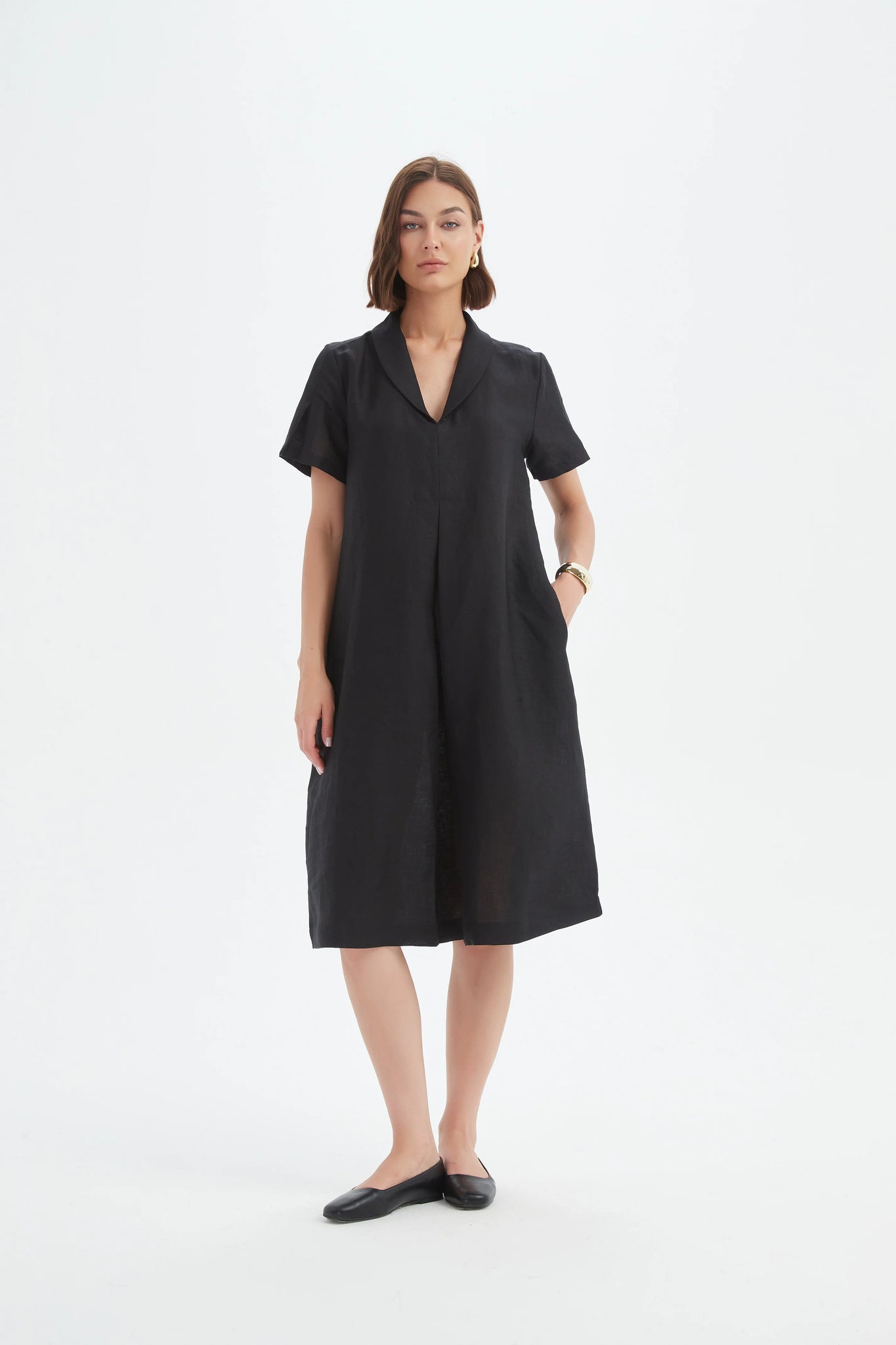 The Shawl Collar Pleat Dress is a timeless addition to your wardrobe, crafted from 100% French Linen for effortless comfort and breathability. Featuring a shawl collar, short sleeves, and inverted pleats on the front and sleeves, this elegant midi dress offers a relaxed yet refined silhouette.