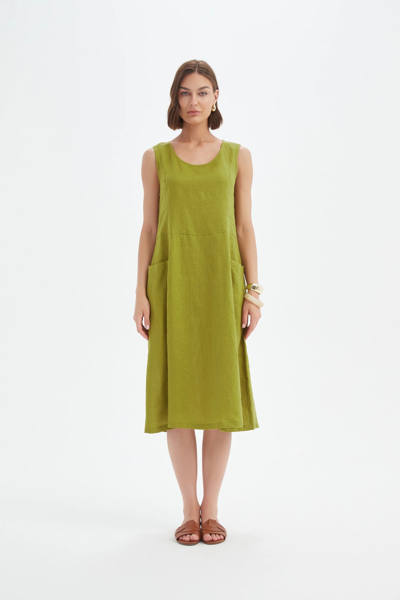 Light, airy, and effortlessly chic, the Sleeveless Pocket Dress is a summer wardrobe essential. Crafted from 100% French Linen, it features a scoop neckline, structured princess seams, and a flattering A-line silhouette that skims the body. Practical pockets add functional elegance, making this dress perfect for easy summer dressing.