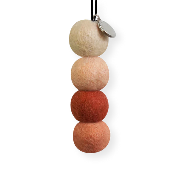 4 Unscented Ethically Sourced Wool Felt Balls with branded charm and elastic string for easy hanging.