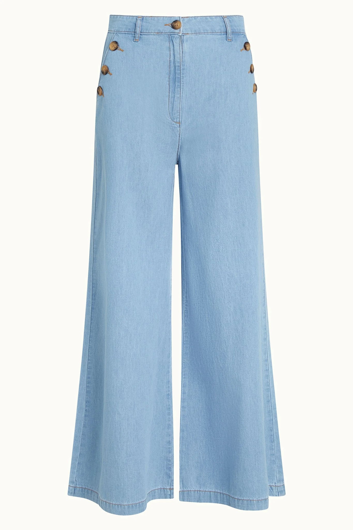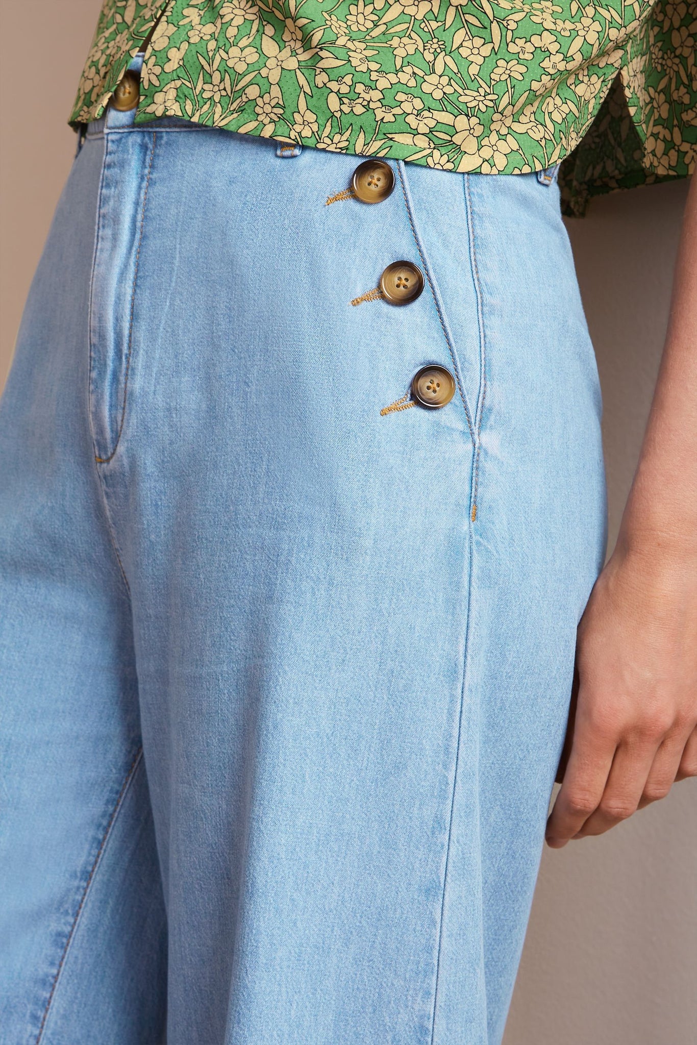 Introducing our Pirla Pants, a refreshing twist on our Peppa Pants. Made with light denim and featuring buttons on the pockets, these pants are perfect for beating the heat on hot summer days.