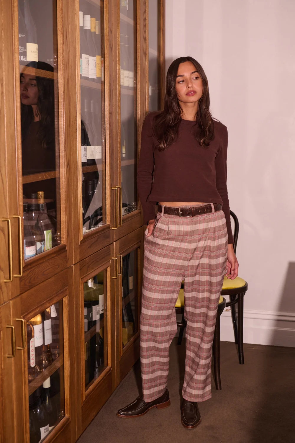 Brick. The polished yet relaxed feel of the Brick pant makes them versatile from day to night. Cut from a light weight but flowy and flattering check fabric, and designed to sit high on the waist with suit pant pleats. These have a slightly cropped leg that flatters all shapes.