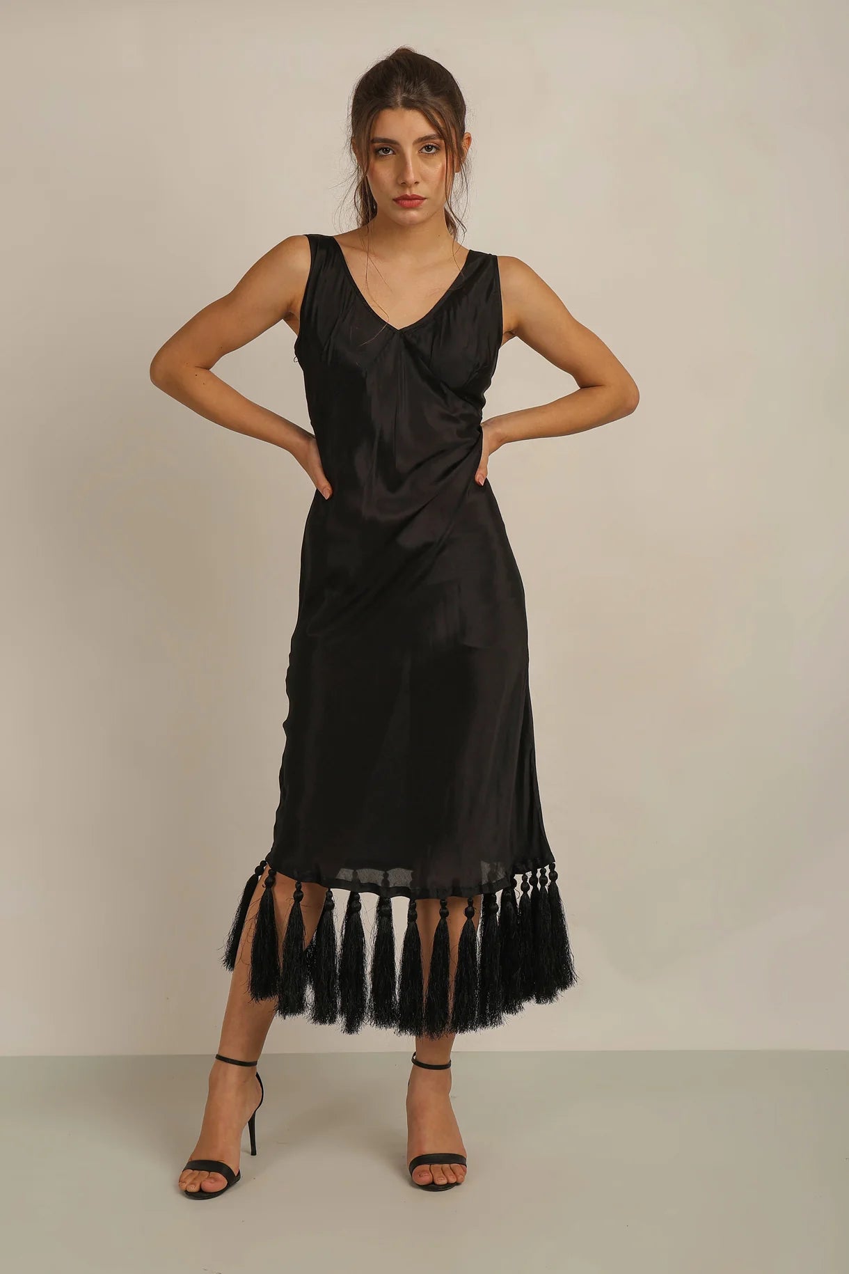 The ZAZA TASSEL DRESS BLACK is sure to amaze with its stunning tassels and bias cut, creating a flawless silhouette. Made with quality material and expert craftsmanship, this dress is perfect for that special occasion. Experience the drama and elegance of the ZAZA TASSEL DRESS BLACK.