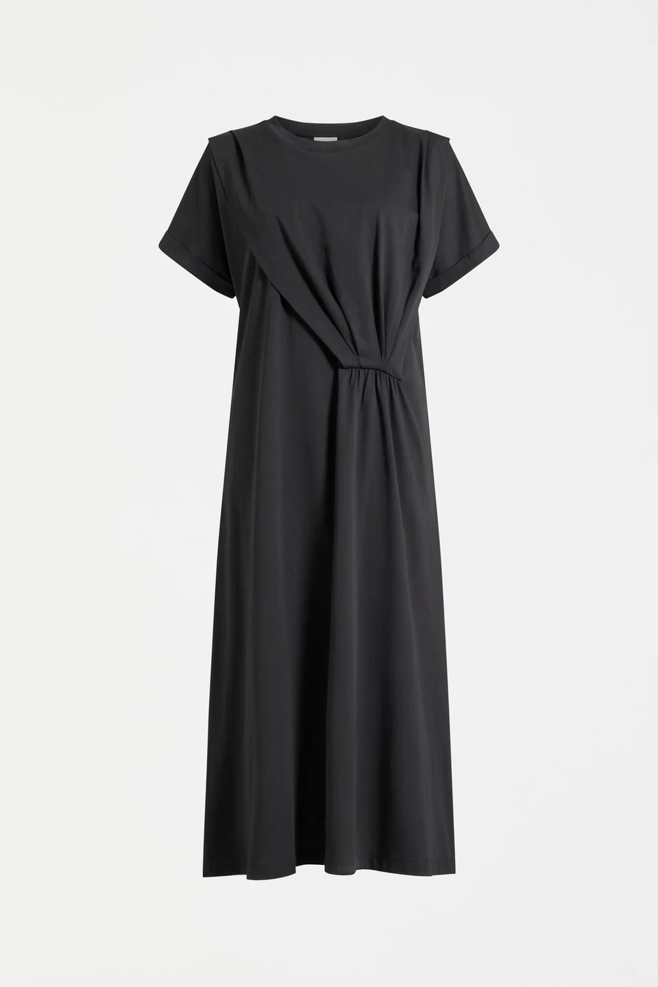 The Etienne Tshirt Dress a relaxed, yet refined jersey dress crafted from a soft organic cotton. The asymmetric design features a flattering waist tuck detail that adds shape and interest. A regular fit dress with classic crew neck, turned-up short batwing sleeves, and a gently flared skirt. This midi dress is finished with gentle gathers from the shoulders and side-seam pockets. An easy and very comfortable pull-on silhouette that you’ll reach for time and time again. Style with sneakers or sandals for casual days or with flats or heels and metallic jewellery for more polished looks.