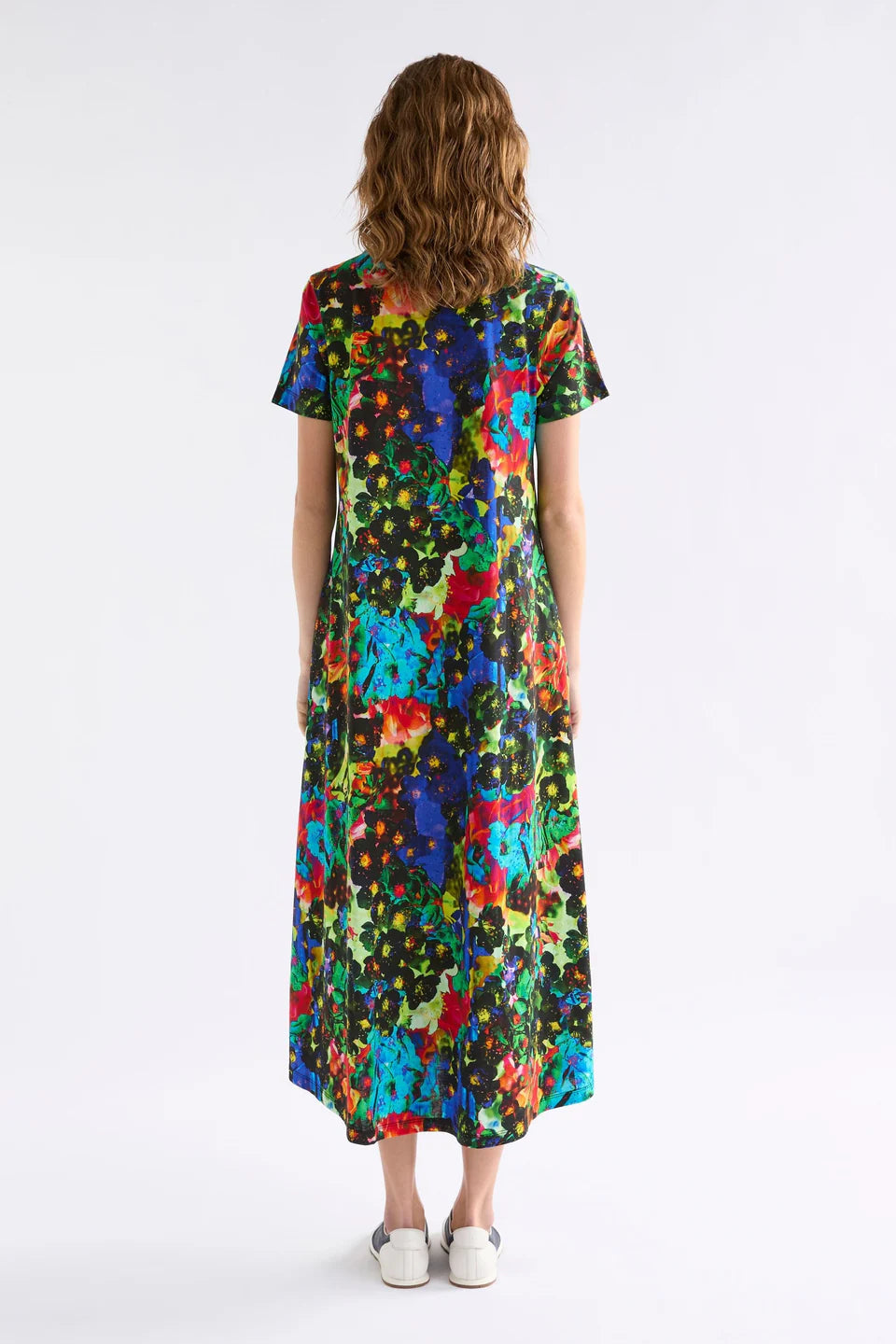 The Holst Tshirt Dress is a midi-length A-line, ELK classic T-shirt dress, crafted from soft organic cotton jersey. Featuring the digitally printed, vibrant and electric Apelle Print, this regular fit dress has a classic t-shirt fit through the upper body with set-in short sleeves, flowing to a relaxed A-line silhouette from the waist. An easy everyday style that pairs easily with sneakers for casual wear, sandals for warmer days or flats for more elevated occasions. An easy slip-on, one-and-done style offering everyday comfort for no-fuss dressing.