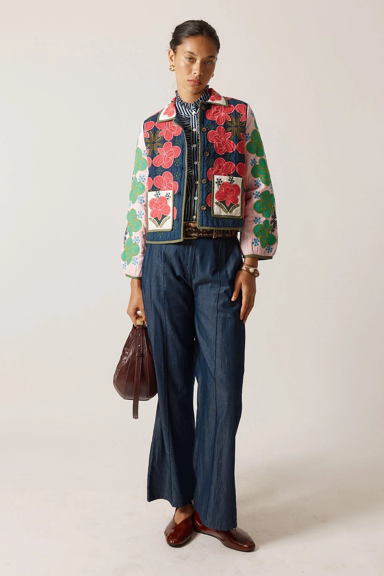 Embrace effortless style with the Rubyyaya Folklore Jacket Multi. This cropped, collared jacket features intricate applique embroidery that adds character to any outfit. Crafted from 100% cotton with light quilting for subtle warmth and structure, it offers full-length sleeves for versatile layering.