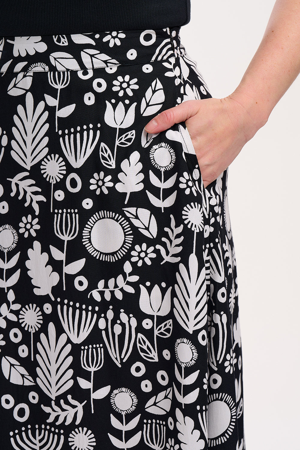 The Krista Skirt is a fun new spin on the Cecilia silhouette – now with handy side seam pockets (because who doesn’t love a practical detail?). This updated midi skirt features a flattering A-line shape and an elasticated back waistband for everyday ease. We’re loving it in the retro Floral Folk print – a playful print of 70s-inspired white leaves and flowers on a versatile black base. Pair with your fave knit now and a tee later – Krista’s got you covered all year round.