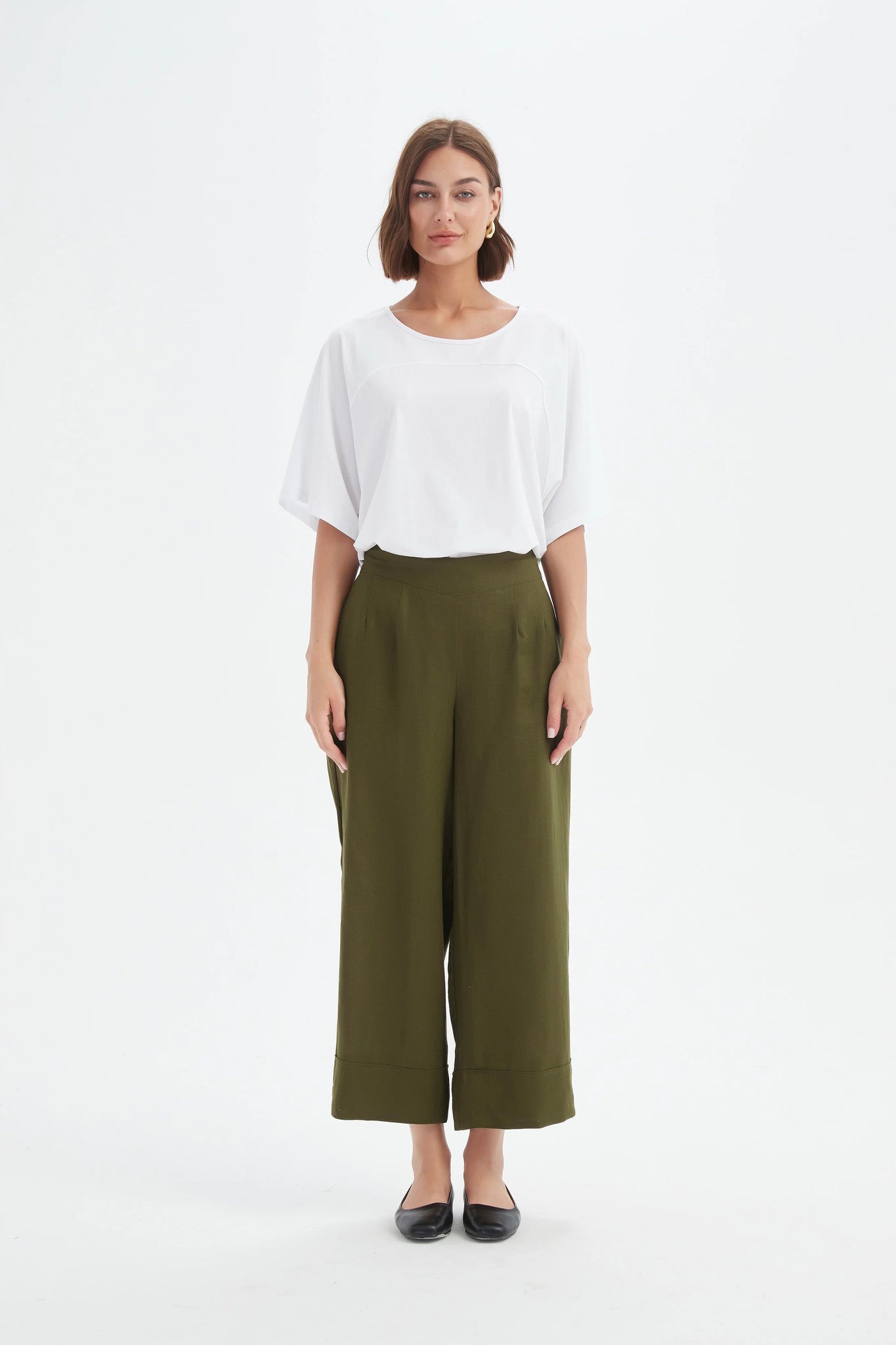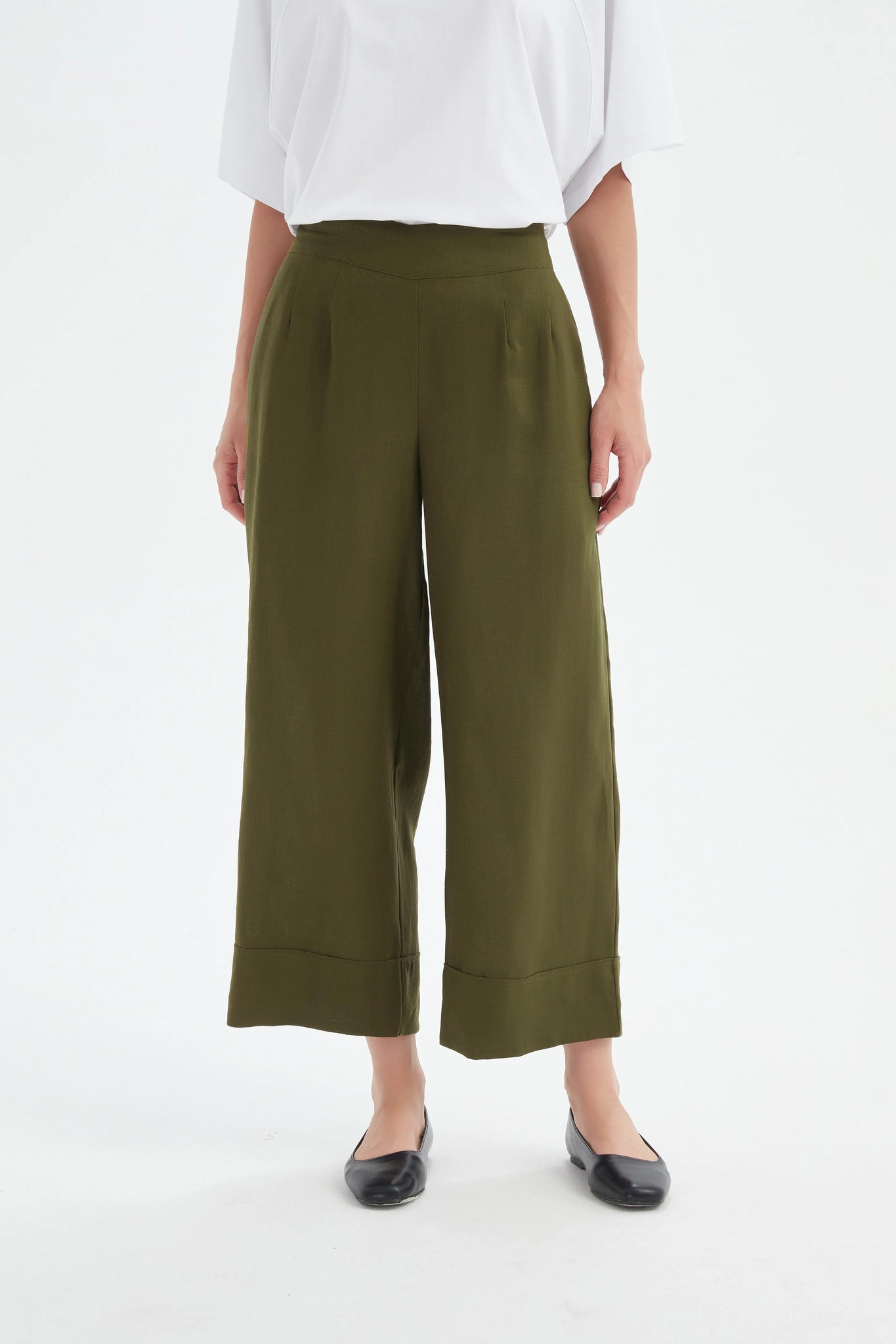 • Load image into Gallery viewer, Tirelli Wide Leg Linen Pant Dark Moss
