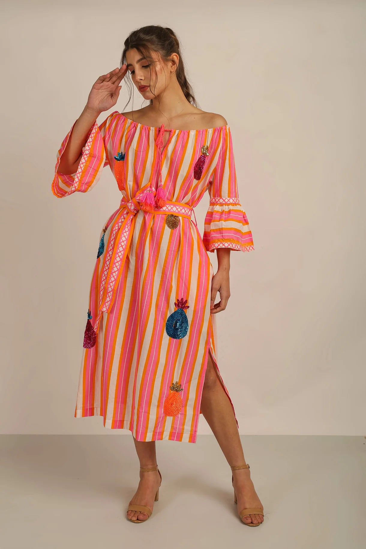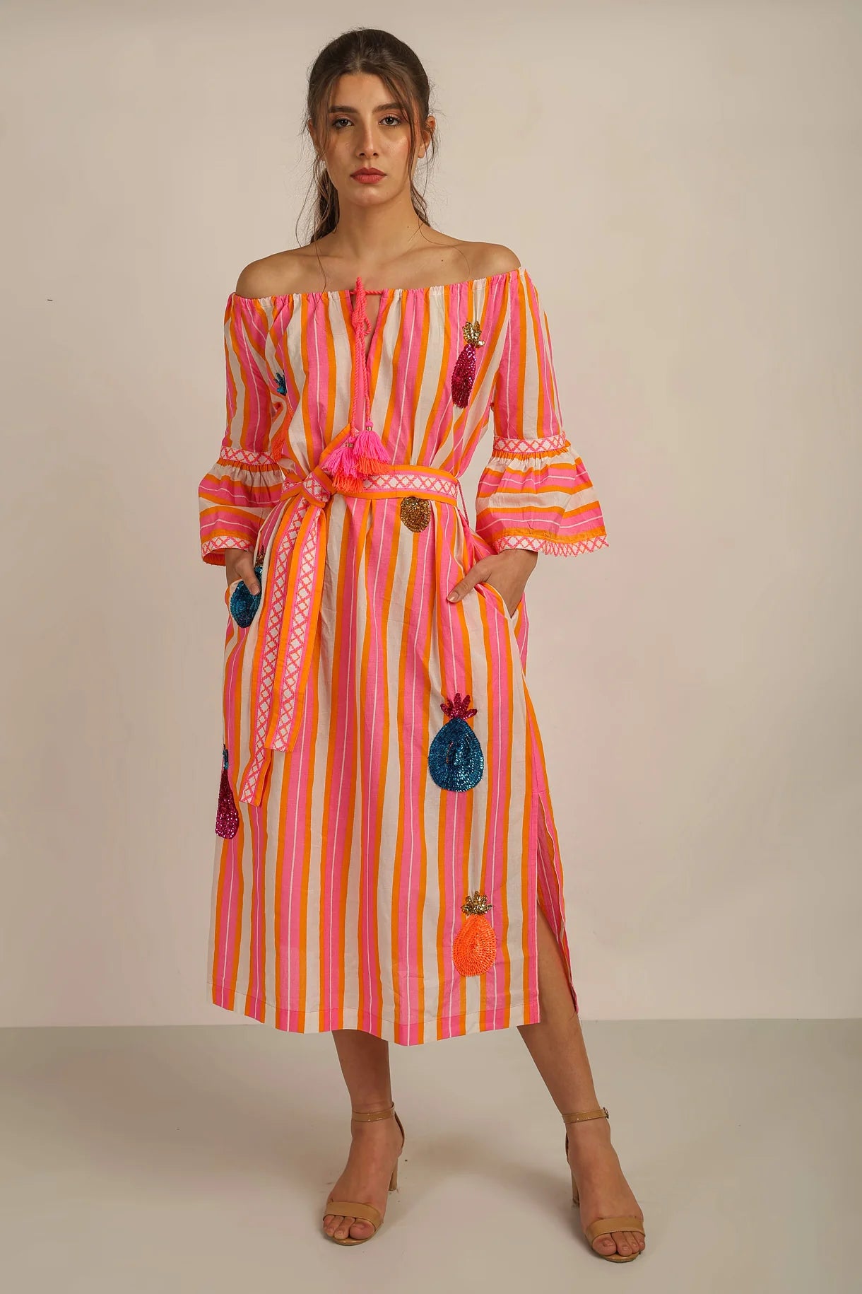 Effortlessly chic, the MALTA OFFSHOULDER DRESS combines comfort and style. Made from a vibrant, cotton striped fabric, this dress features an off-shoulder design and is beautifully embellished with sequin pineapples. Perfect for any occasion, elevate your wardrobe with this fun and fashionable piece.
